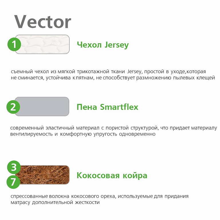 Vector - максимально жёсткая модель в коллекции Smart. Асимметричная конструкция позволяет сменить ощущения, переворачивая матрас. Жёсткость кокосовой койры подчёркнута слоем термоволокна с одной стороны и контрастирует с приятной упругостью Smartflex с другой. Матрас Vector подходит любителям жёсткого спального места, а также детям и подросткам.