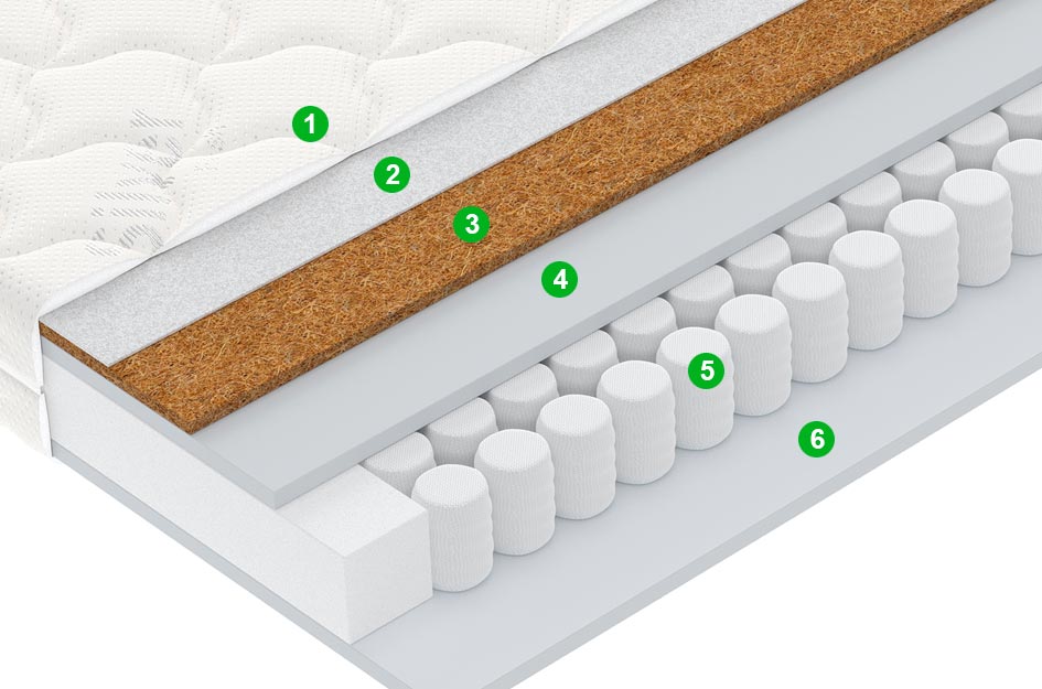 | Кокосовая койра | Натуральный материал из кокосовых волокон, спресованных в однородные плиты. Слой используется для придания матрасу дополнительной жесткости. |