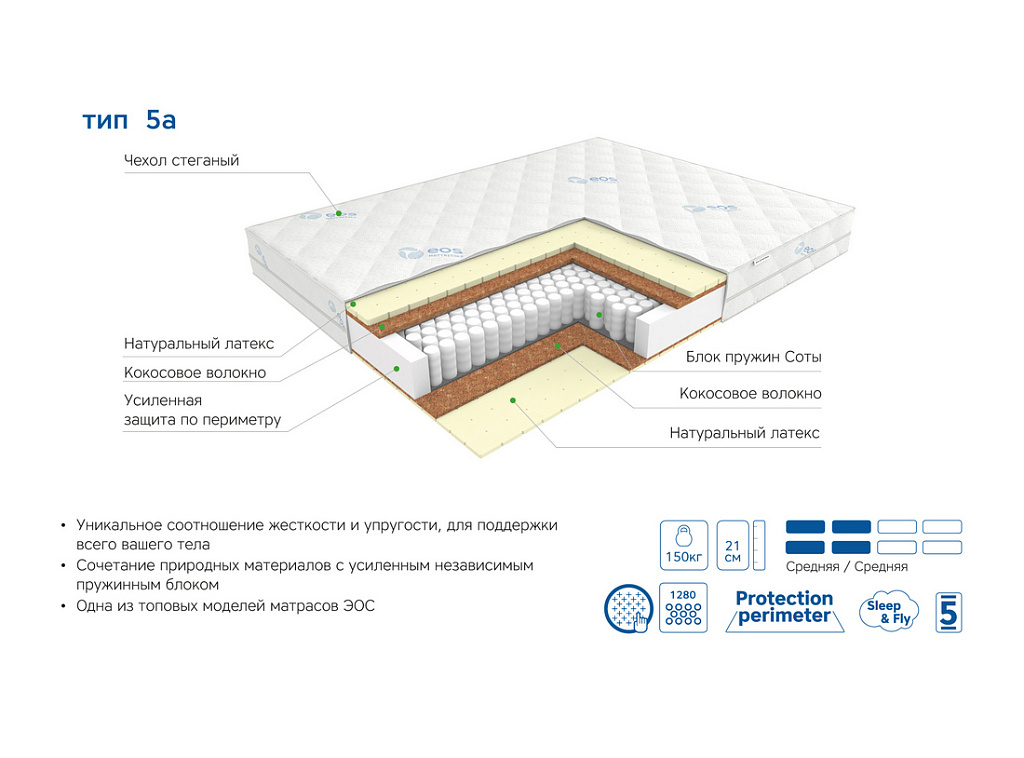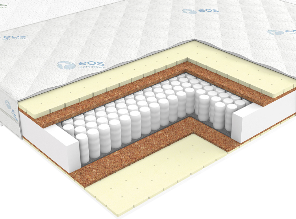 | Материал | Латекс, Блок независимых пружин, Чехол, Кокосовое волокно, Усиление по периметру матраса |