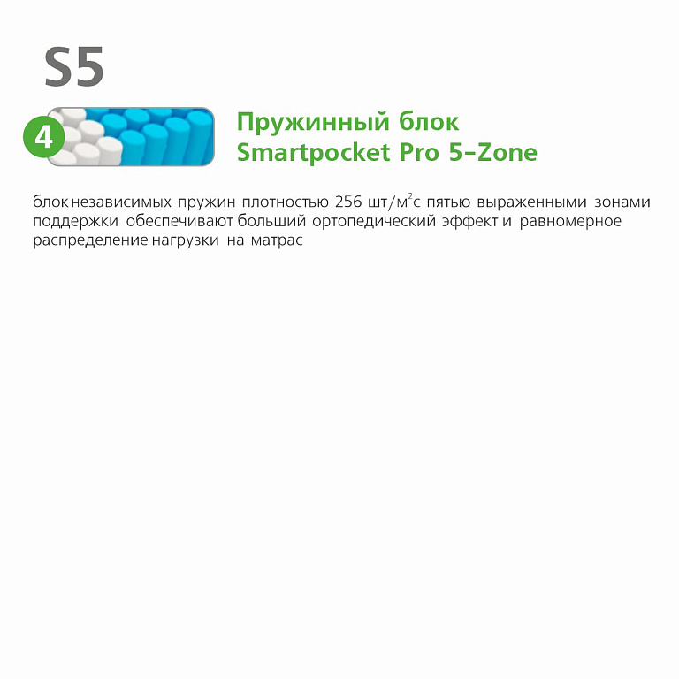 Smartpocket PRO 5-Zone Усовершенствованный блок независимых пружин Smartpocket плотностью размещения 256 пружин на м2. Каждая пружинка упакована в отдельный чехол и работает самостоятельно, отдельно, независимо от других пружин в блоке. Такой блок принимает форму тела спящего на матрасе - в этом и заключается ортопедический эффект. Усиление ортопедического эффекта происходит благодаря пяти выраженным зонам поддержки, которые равномерно распределяют нагрузку на матрас для более комфортного и здорового сна.
