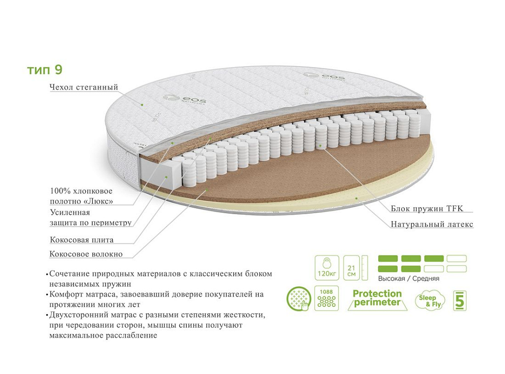 МатериалЛатекс, Блок независимых пружин, Хлопковое полотно, Чехол, Латексированная кокосовая плита, Усиление по периметру матраса