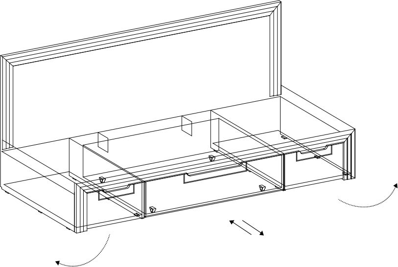 • Имеет один вместительный выдвижной ящик (размеры: ширина 965 мм, высота 200 мм, глубина 785 мм.) на колесных опорах и две закрытые ниши с фасадами;