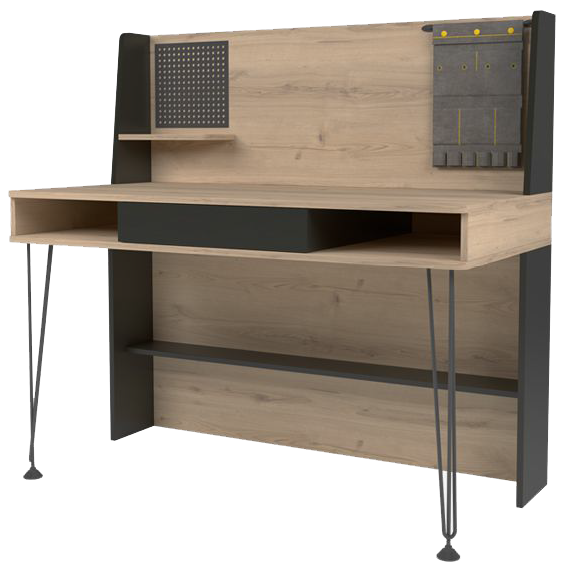 Стол имеет удобный выдвижной ящик. Накладной текстильный органайзер на фасаде позволят держать под рукой все необходимые принадлежности. Над полочкой размещается металлическая перфорированная доска для магнитов, куда можно прикреплять расписание уроков или другую информацию.