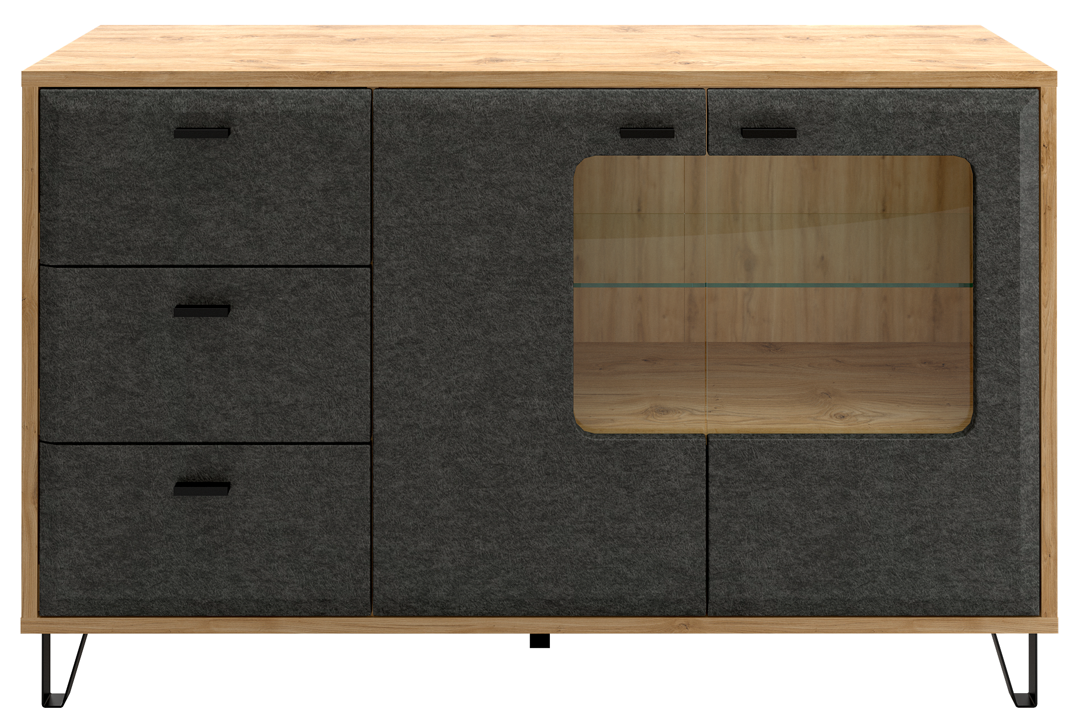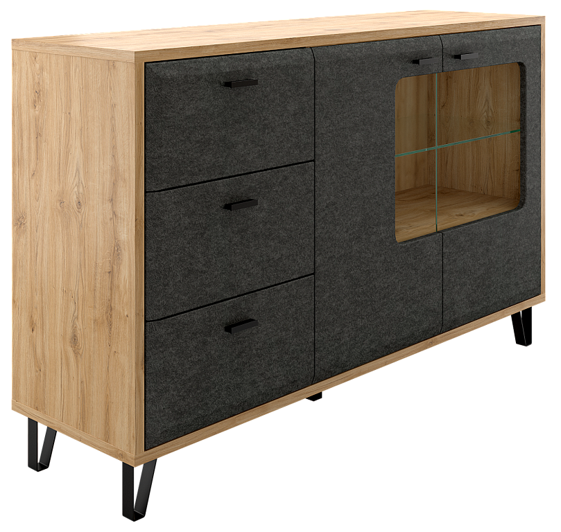 • Скругленная форма фасада в цвете "Графит" и  стильные металлические ножки позволят безупречно оформить гостиную комнату.