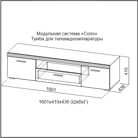 Модуль разделен вертикальными перегородками на три отделения. Отделения по краям комплектуются распашными створками. Среднее отделение имеет открытую нишу и выдвижной ящик с телескопическими направляющими полного выдвижения.