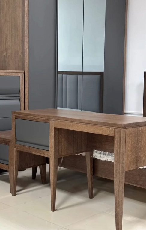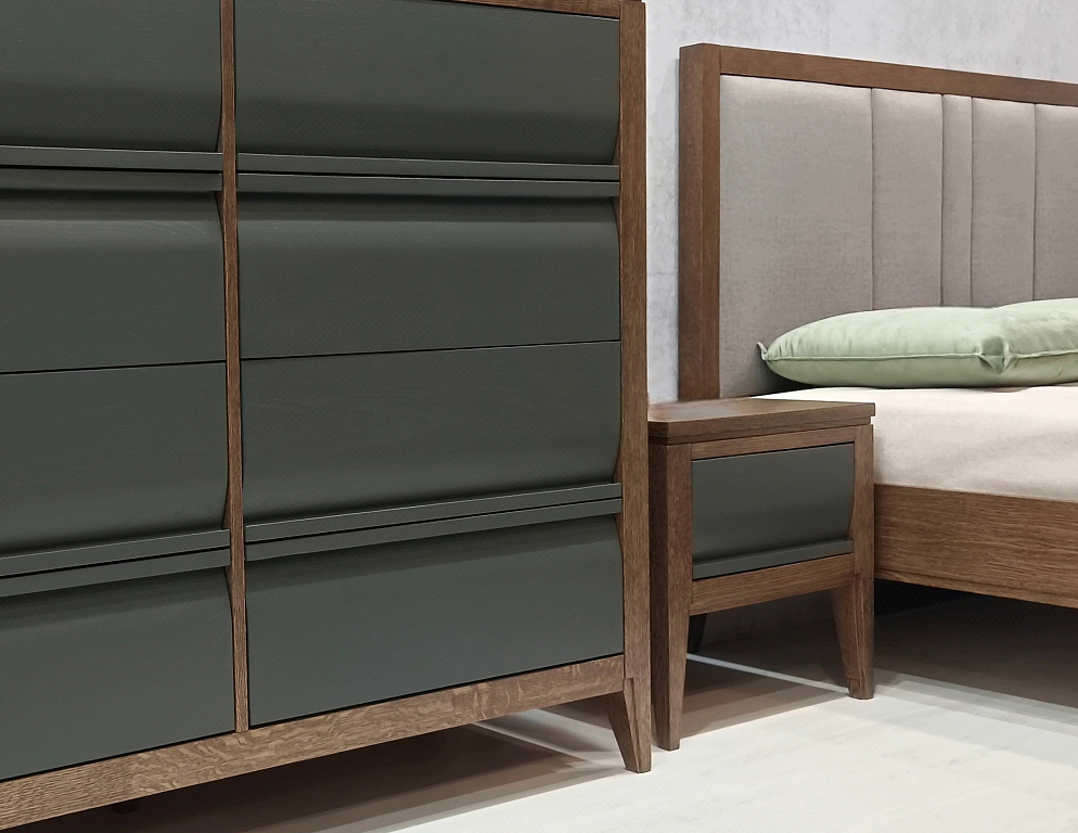 Коллекция Аспен Антрацит для спальни — это строгий дизайн с акцентом на графитовые фасады и натуральную текстуру. Контраст тёмных оттенков и стеклянных элементов подчёркивает современный стиль и визуальную глубину.